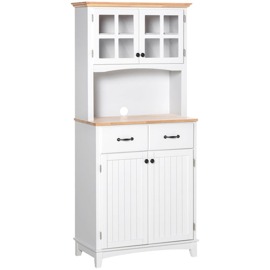 Freestanding Kitchen Cupboard, Kitchen Storage Cabinet with Framed Glass Doors, 2 Drawers, Microwave Counter, White